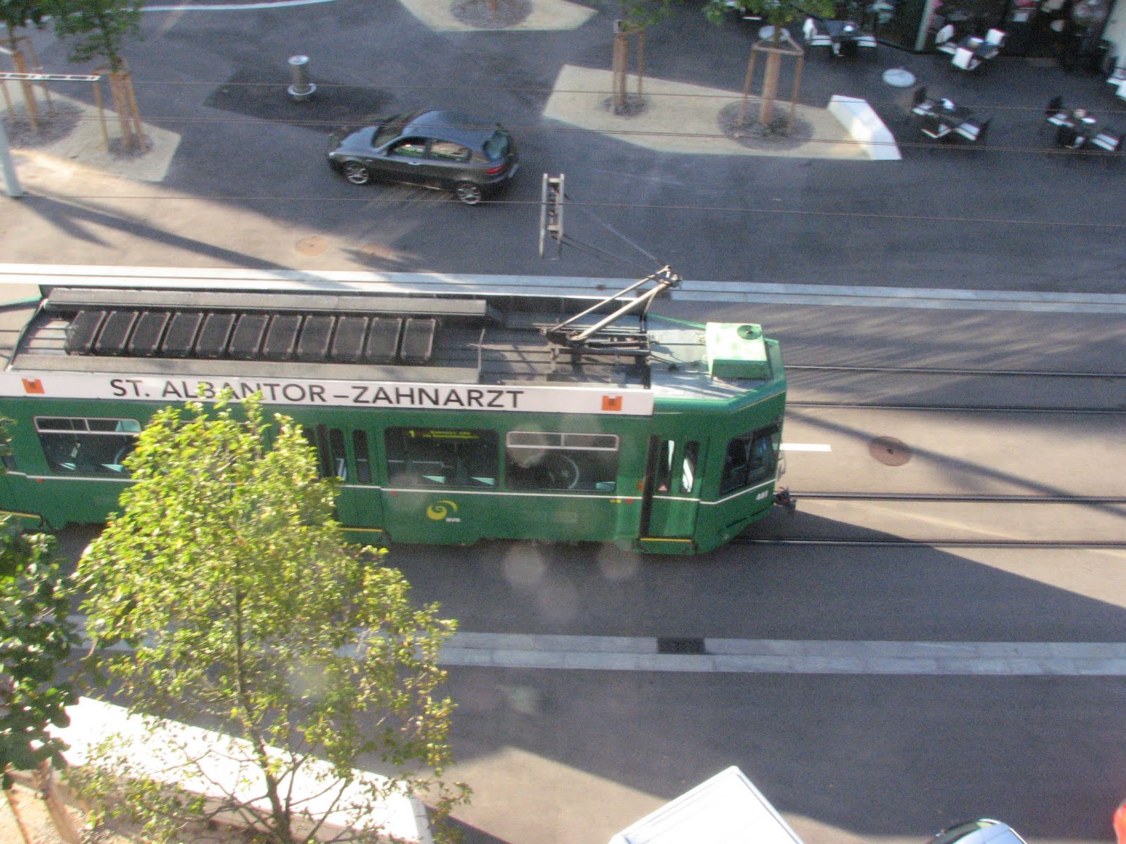 What does all this have to do with now. We live on the 4th floor (actually the fifth level---the entry floor isn't numbered) in a new apartment building (see above) in the section of Basel known as St. Johann. We are located right where the building starts to curl at the near end as it comes to the corner of the block. So when I sit and eat at our kitchen table which has elevated bar-height chairs, I see a lot of this: